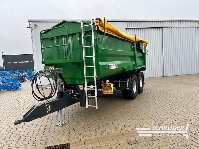 Zentralachs-Muldenkipperanhänger, 22 t zulässiges Gesamtgewicht (davon 4 t Stützlast), in serienmäßiger Ausstattung, Muldenlänge ca. 6.000 mm anstatt 5.200 mm, Ölbedarf 32,5 Liter, Rungentaschen innenseitig an Bordwandkante für steckbaren Bordwandaufsatz, (OHNE Aufsatz), Vorrüstung für klappbaren Bordwandaufsatz, Sichtfenster mit Schutzgitter in Stirnwand, Abmaße ca. 355 mm breit und, ca. 625 mm hoch, Aufsteckdreiecke vorne und hinten (300 mm) + Mitteldreieck mit , abklappbarem Spriegelbaum, Laufsteg mit Unfallschutzbügel an Stirnwand (gem. UVV-Richtlinie), Gelbe Abdeckplane (verstärktes Material), mit Alu-Rollbrett, (Seitenbefestigung mit 2 x Gurt-Ratschen); abnehmbare Anschlagstützen auf, der rechten Seite, Abschleppvorrichtung am Heck, Verstärkte höhenverstellbare, gummigelagerte Zugeinrichtung ausgelegt für 4 t Stützlast, SCHARMÜLLER Rundschaftzugkopf Typ K80 bis 4 t Stützlast, Achsen montiert oberhalb der Federung, Seitenmarkierungsleuchten (LED), Positions- und Kennzeichenleuchten in LED-Ausführung, 3-Kammer-Rückleuchten eckig, LED-Ausführung, inkl. Blinkerausfallkontrolle, Bereifung 560/60 R22.5 BKT Flotation Radial, Profil FL 630, (65 km/h), 161D (Tragfähigkeit bei 1,5 bar 10 km/h = 4.700 kg), Felgen mit ET +30 mm, , d. h. Spur wird schmaler, Sonderlackierung Chassis: Schwarzgrau RAL 7021, 40 km/h Zulassung gemäß EU-Typengenehmigung, Auslieferung mit CoC-Papieren, mit Plane, Anschlag LINKE Seite